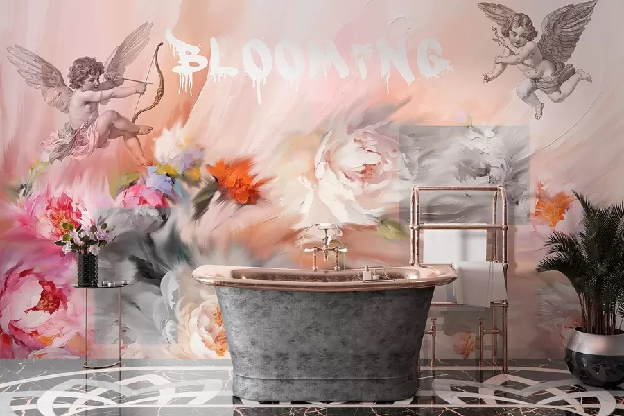 Flores en flor, peonías, pequeños Cupidos con flechas, arte acrílico