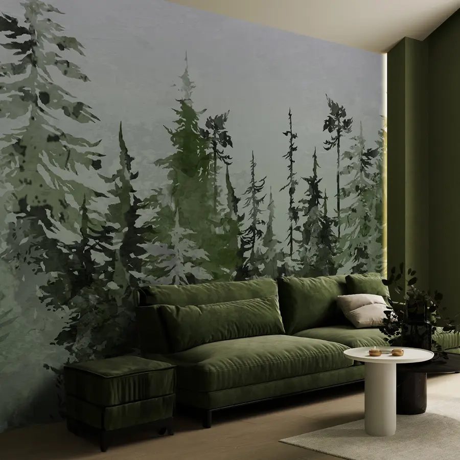 Entre las columnas se encuentran plantas y hojas tropicales y exóticas.