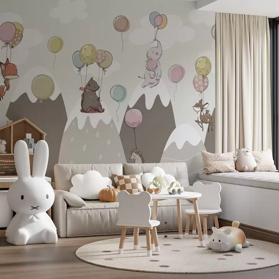 Campamento infantil en cálidos tonos beige, con tienda de campaña y animales del bosque
