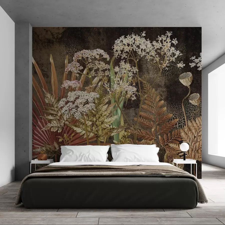 Flores rosas y blancas con tallos y hojas marrones, iluminación suave, colores apagados, arreglo floral