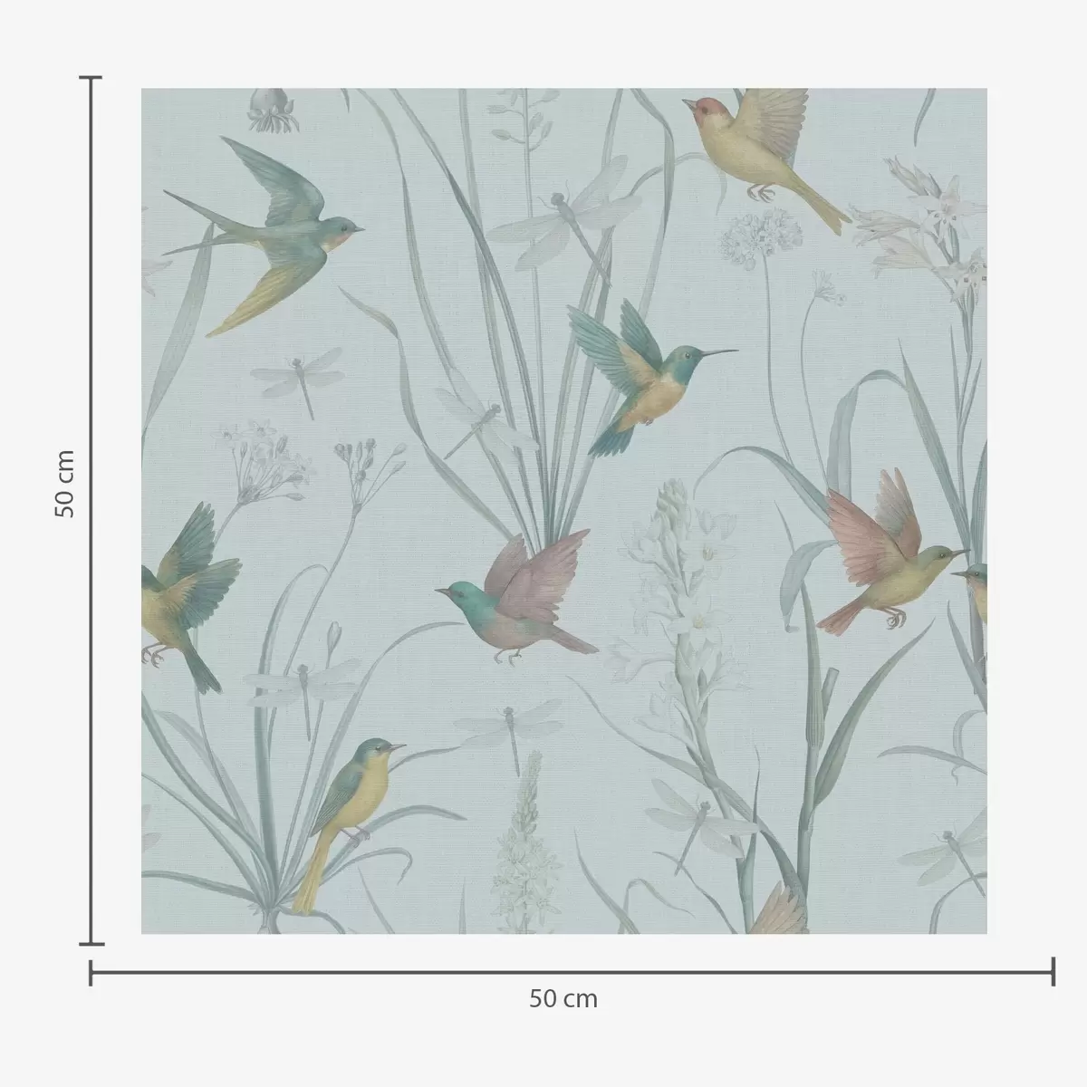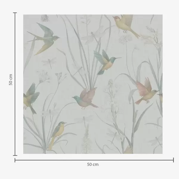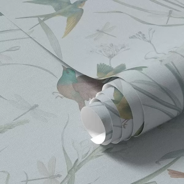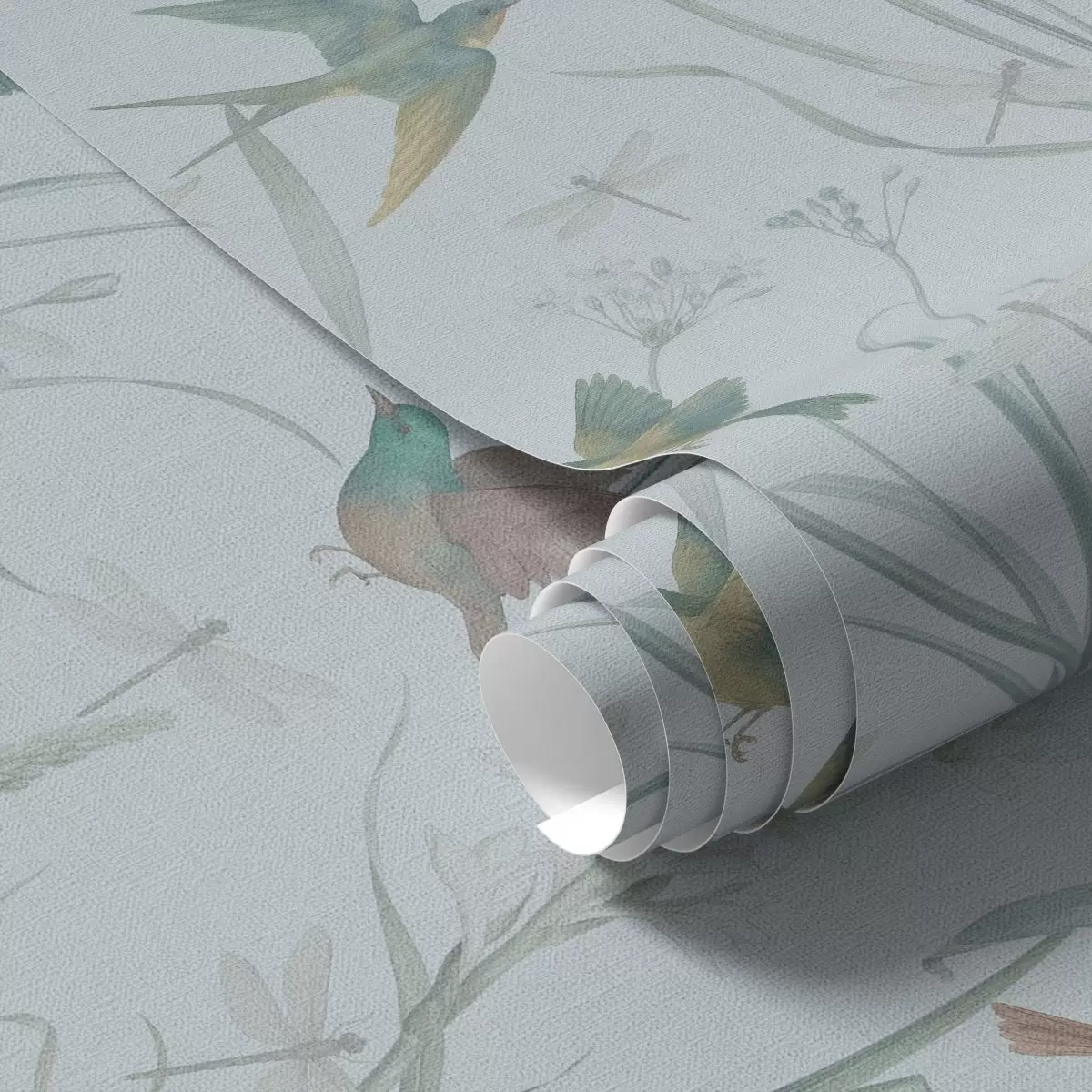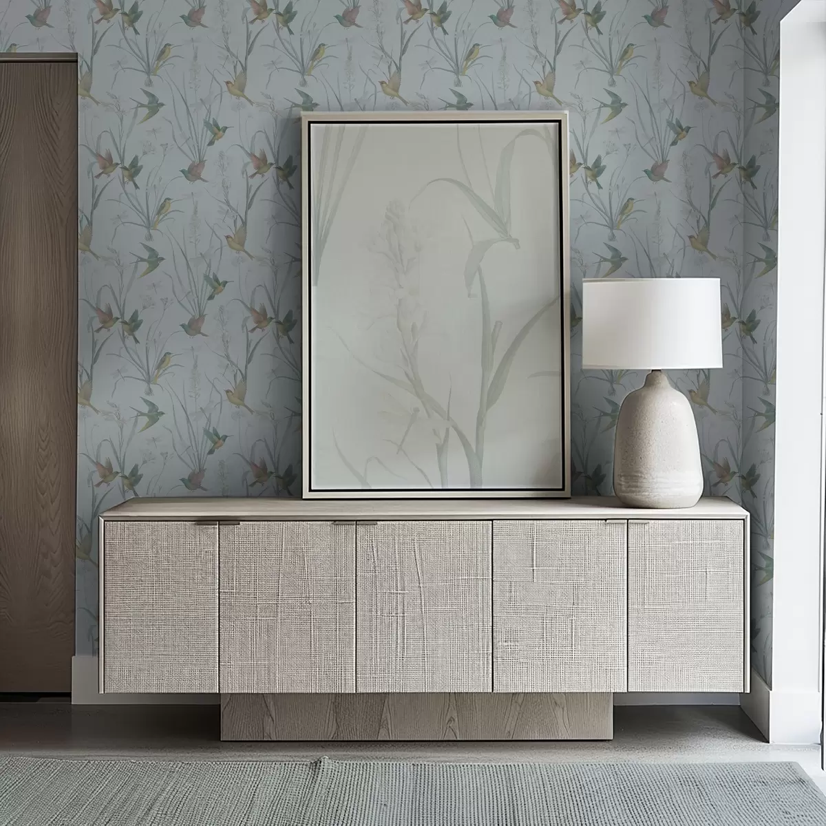 Papel tapiz Pájaros entre la hierba del prado sobre un fondo gris azulado. Nr. a00776