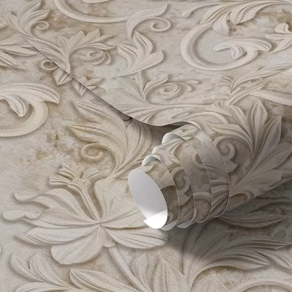 Papel tapiz Relieve en piedra con volutas florales, beige vintage Nr. a00784