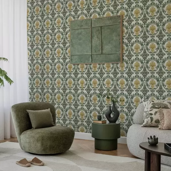 Papel tapiz Damasco con volutas verdes sobre fondo claro. Nr. a00828v1