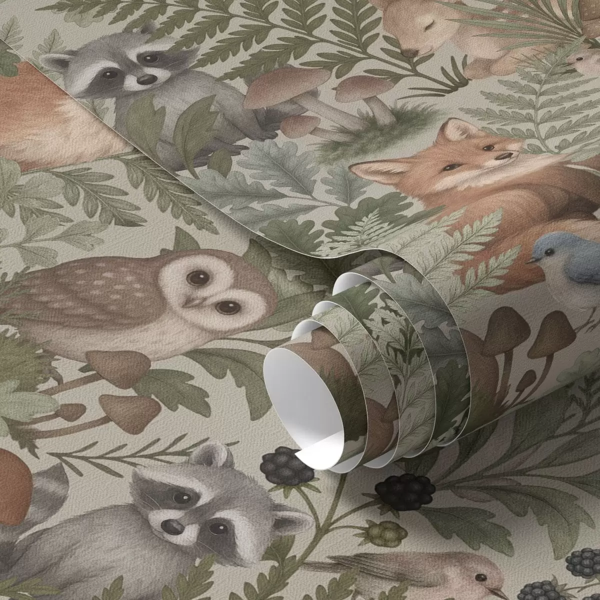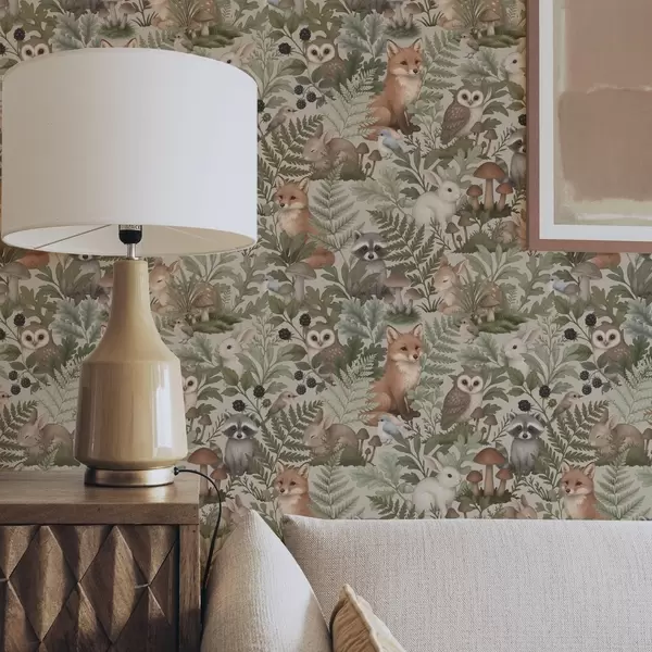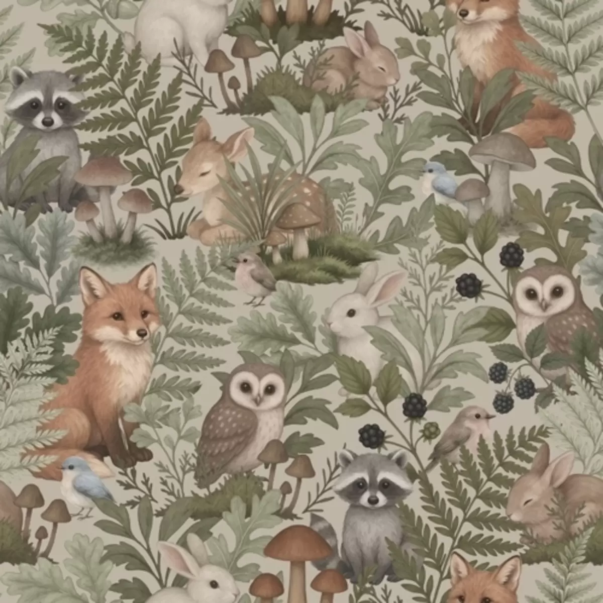 Fotomurales Animales del bosque, helechos y setas sobre fondo beige claro. Nr. a00880v1