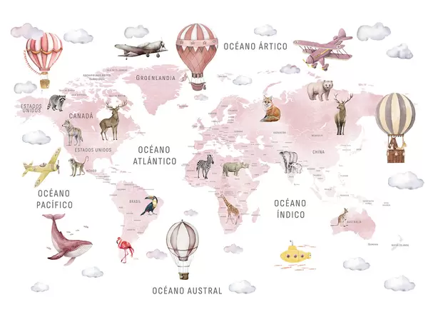 Fotomurales Mapa infantil en estilo acuarela con animales y globos aerostáticos. En español. Color verde. Nr. c00001es