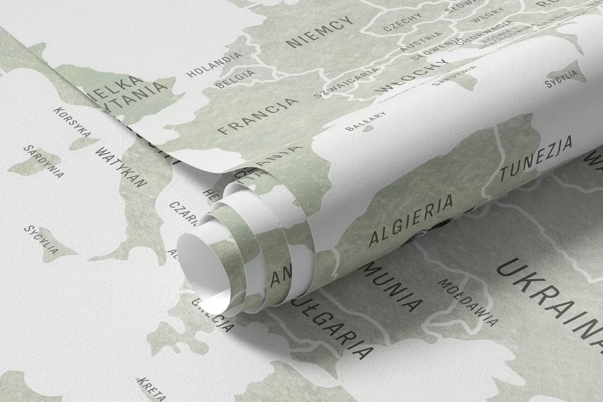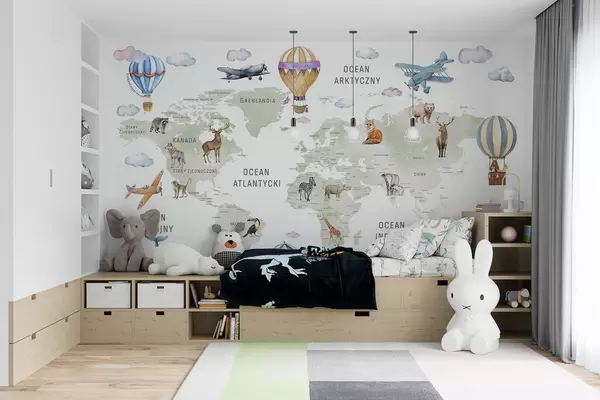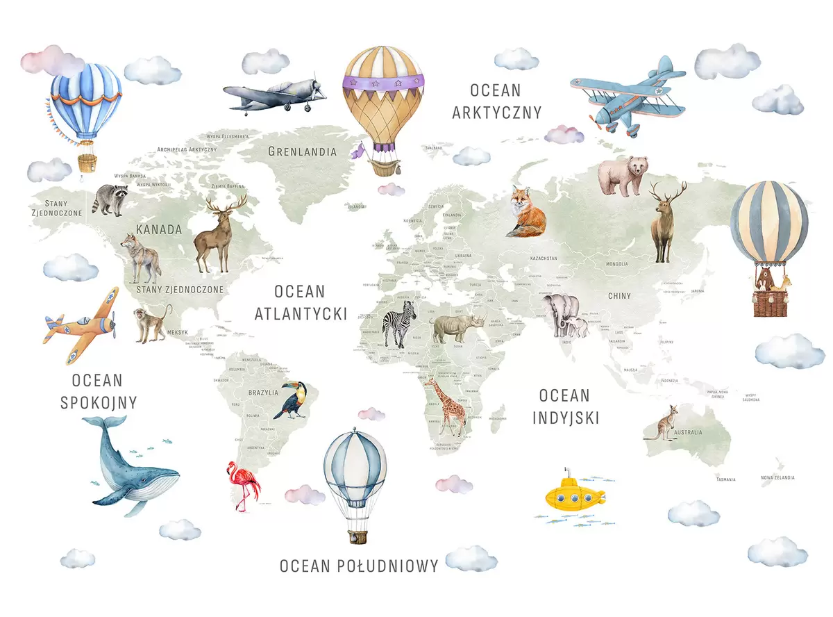 Fotomurales Mapa infantil en estilo acuarela con animales y globos aerostáticos. Idioma polaco. Color verde. Nr. c00001pl
