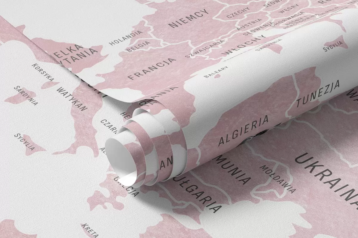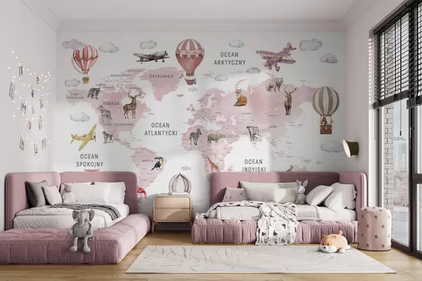 Fotomurales Mapa infantil en estilo acuarela con animales y globos aerostáticos. Idioma polaco. Color rosa. Nr. c00001plv3