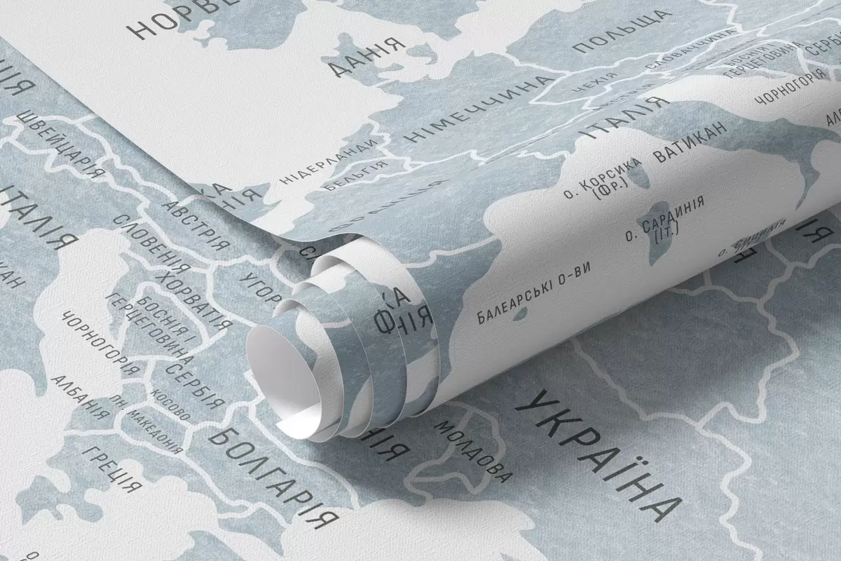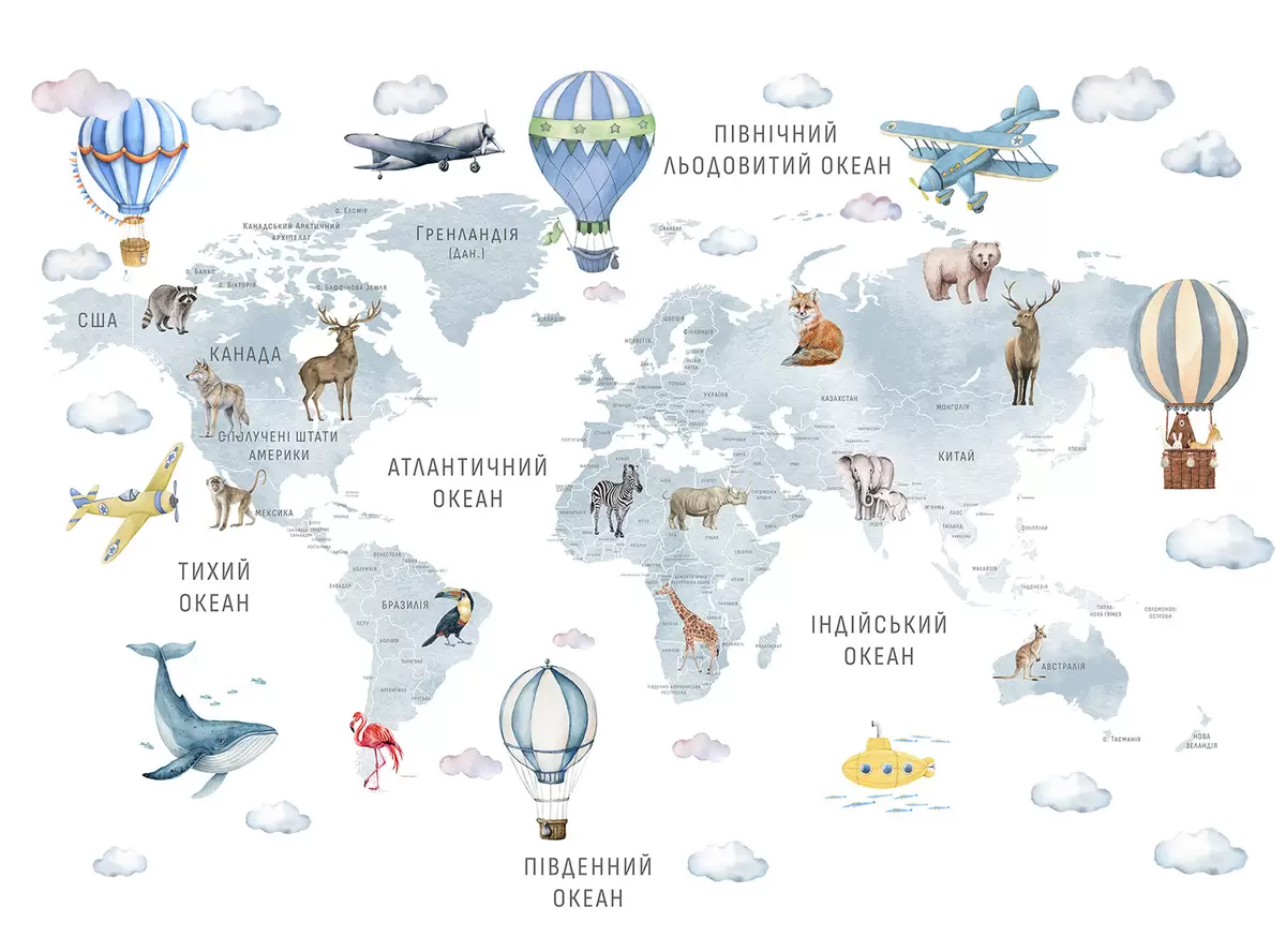 Fotomurales Mapa infantil en estilo acuarela con animales y globos aerostáticos. Idioma ucraniano. Color azul. Nr. c00001ukv1