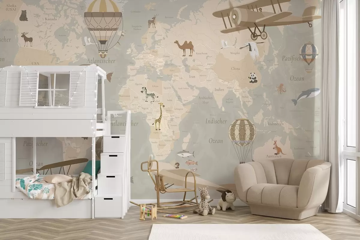 Fotomurales Mapa mundial infantil con animales, aviones y globos aerostáticos. En alemán. Color beige Nr. c00003de