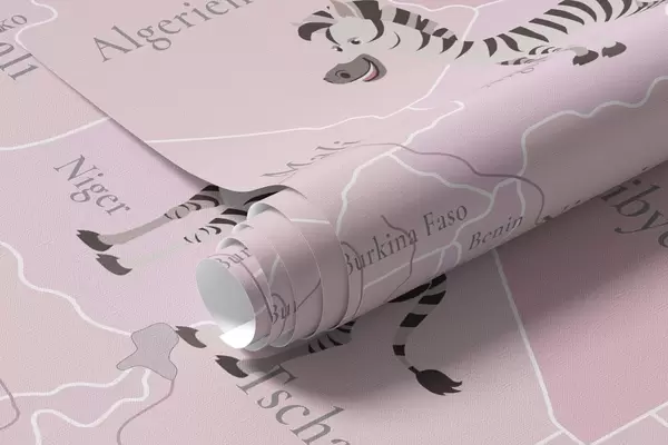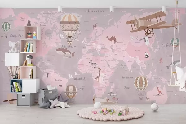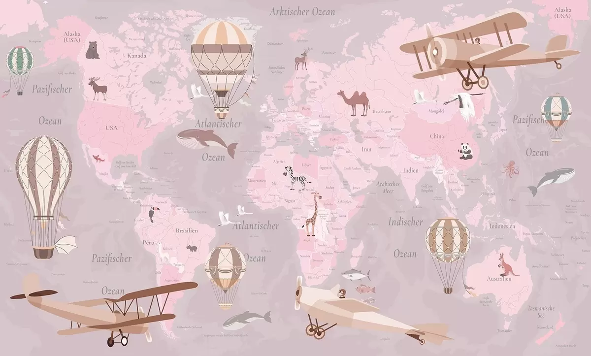 Fotomurales Mapa mundial infantil con animales, aviones y globos aerostáticos. En alemán. Color rosa. Nr. c00003dev3