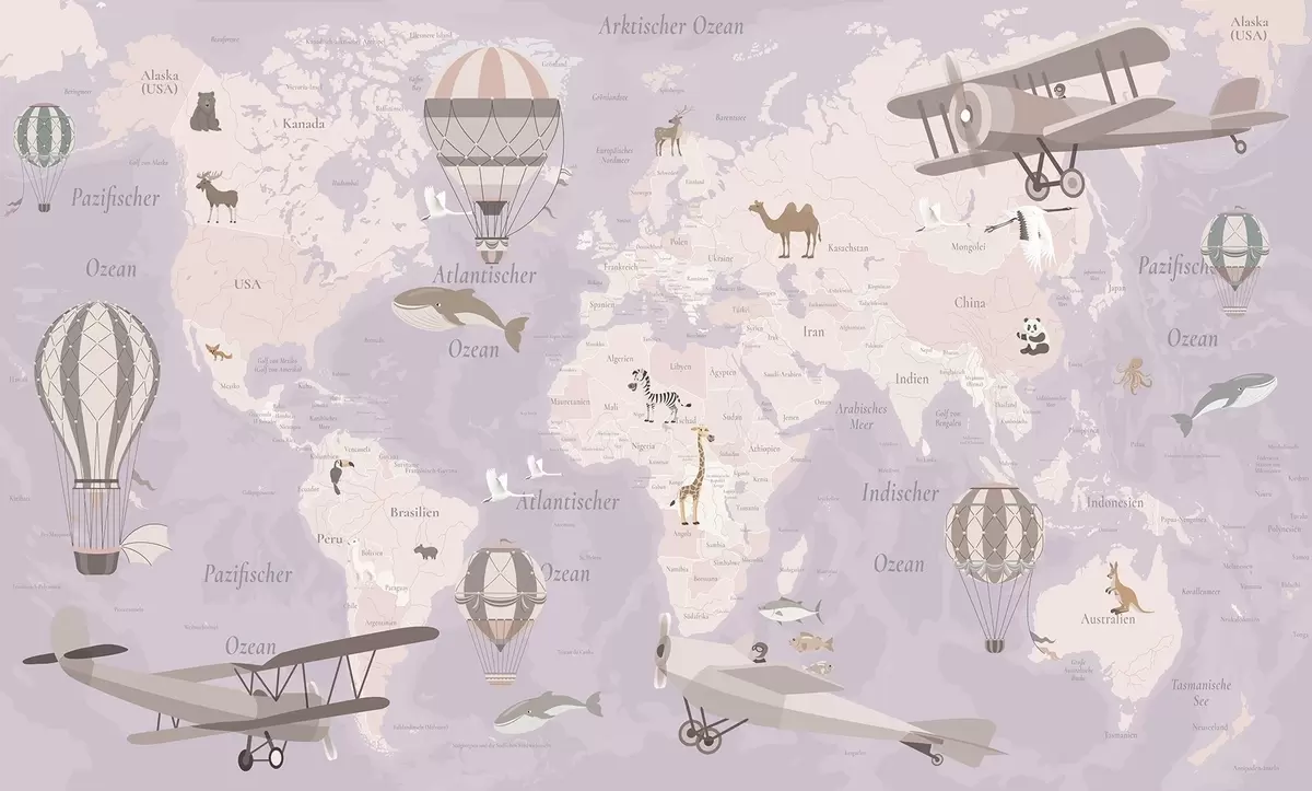 Fotomurales Mapa mundial infantil con animales, aviones y globos aerostáticos. En alemán. Color morado. Nr. c00003dev4