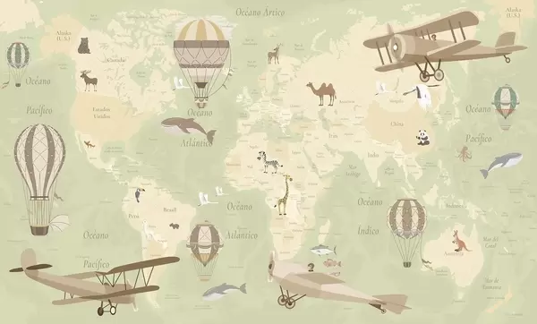 Fotomurales Mapa mundial infantil con animales, aviones y globos aerostáticos. En español. Color beige. Nr. c00003es
