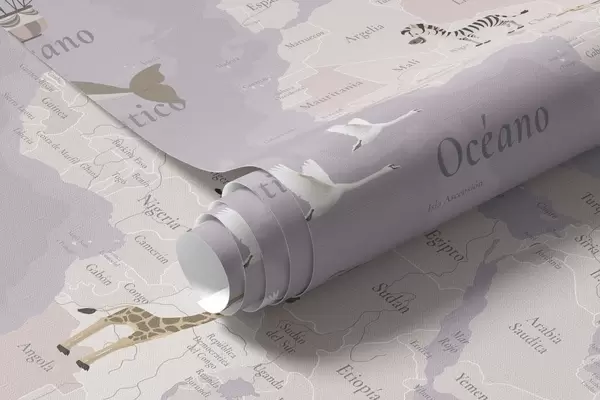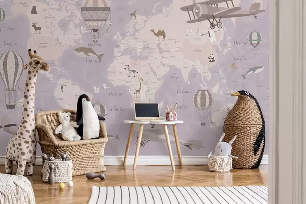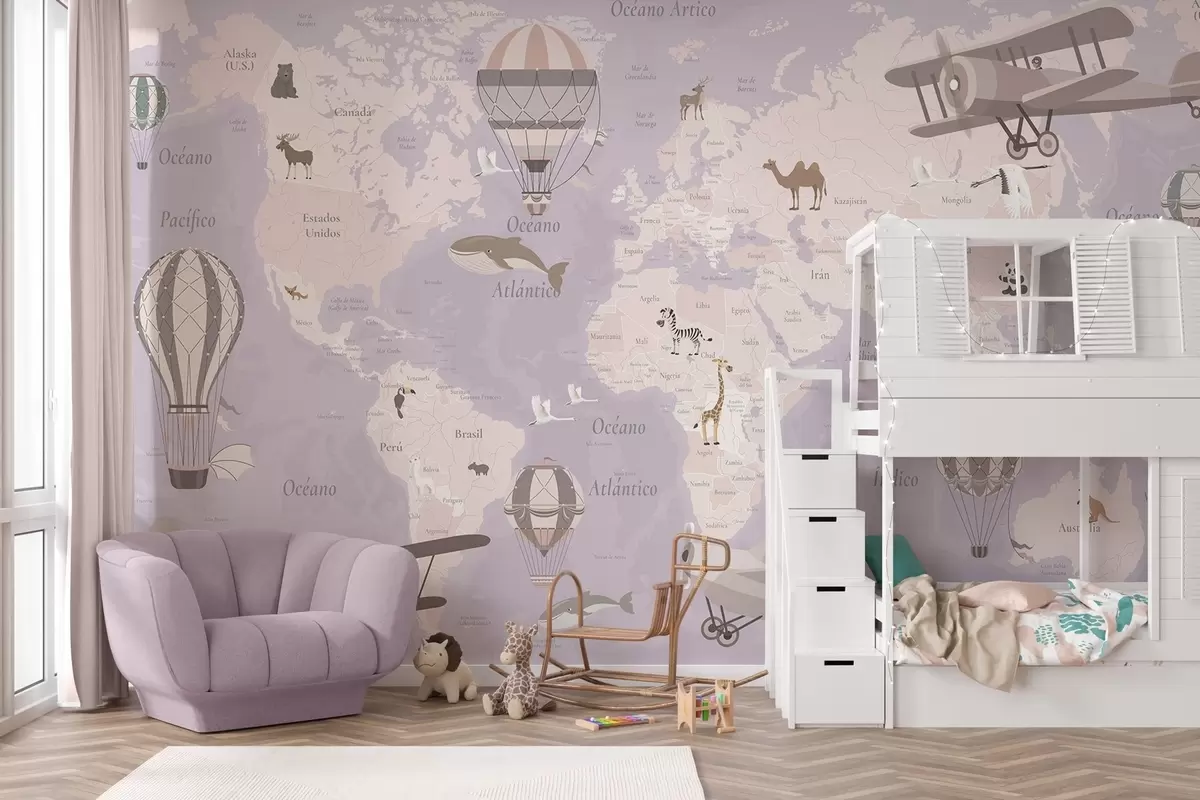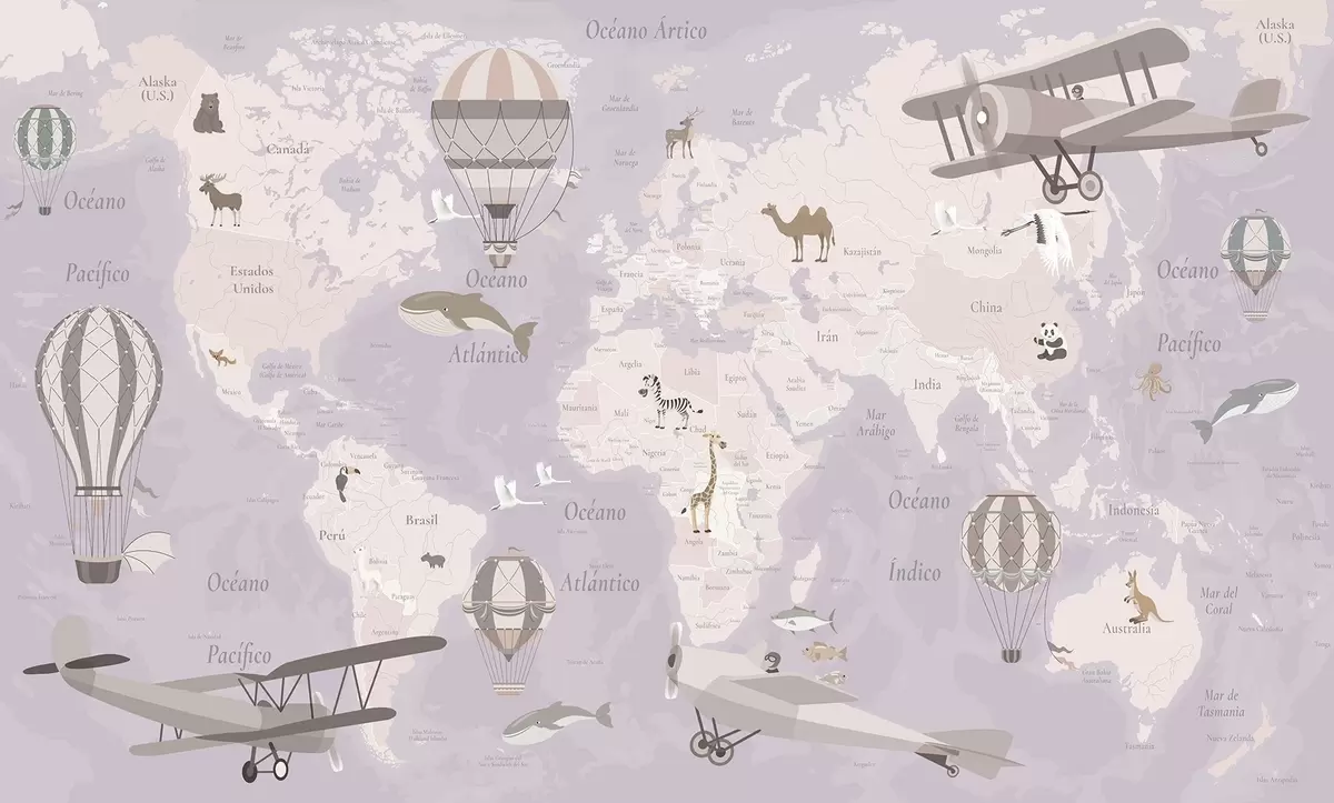 Fotomurales Mapa mundial infantil con animales, aviones y globos aerostáticos. En español. Color morado. Nr. c00003esv4