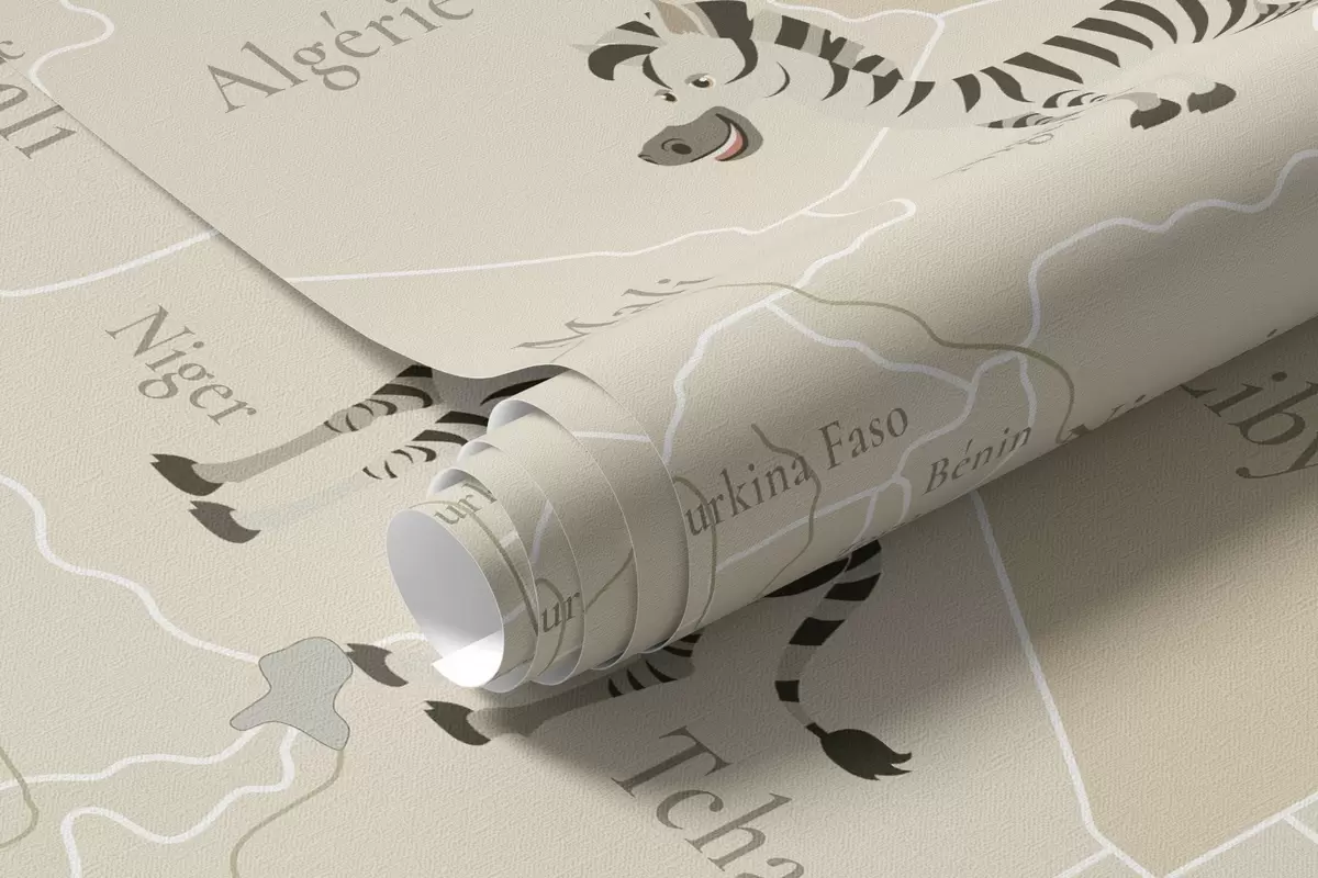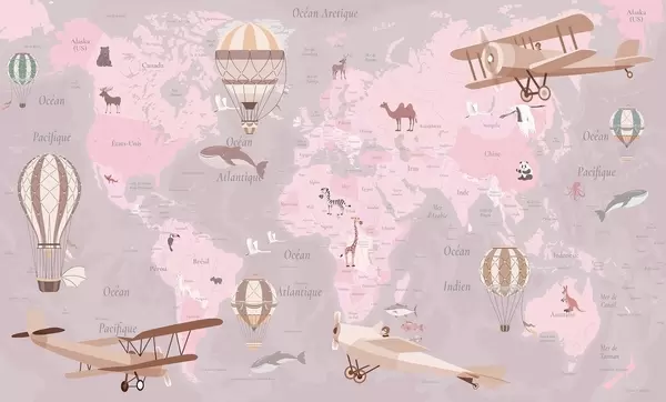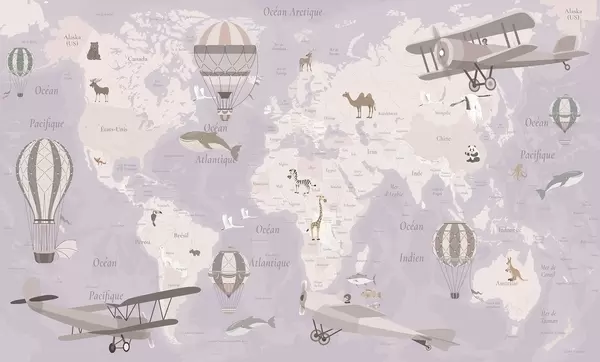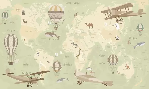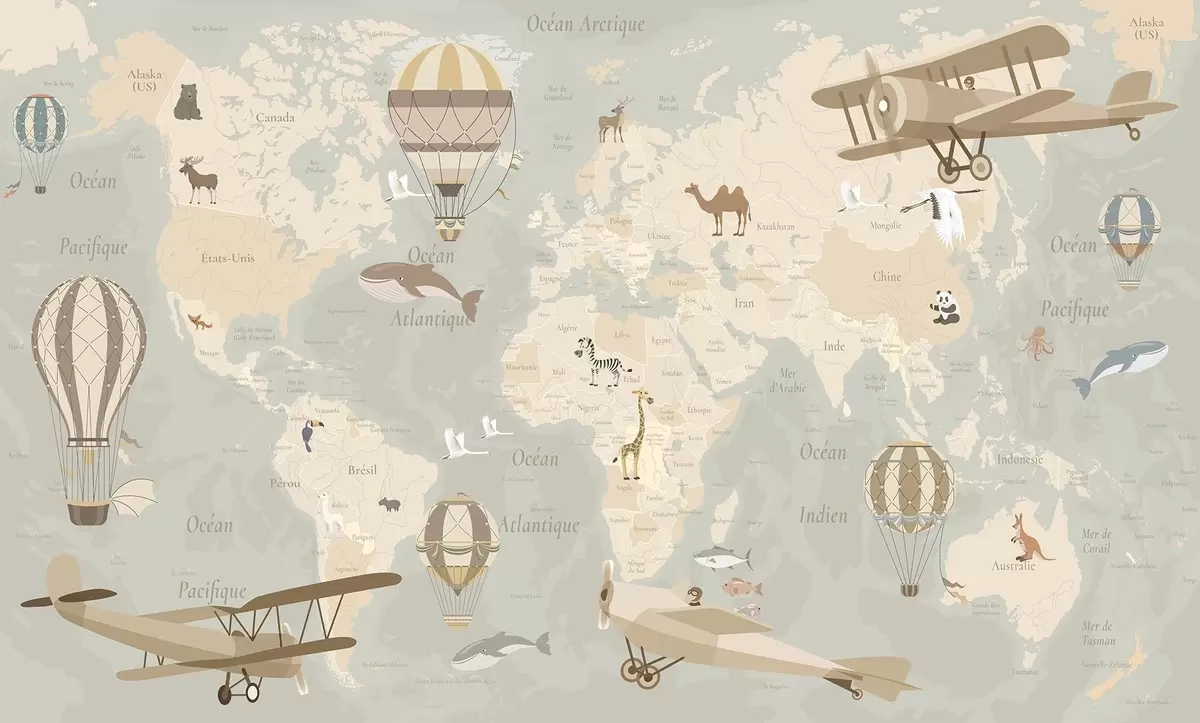 Fotomurales Mapa mundial infantil con animales, aviones y globos aerostáticos. Idioma francés. Color beige. Nr. c00003fr