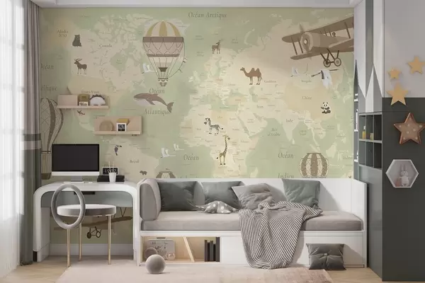 Fotomurales Mapa mundial infantil con animales, aviones y globos aerostáticos. Idioma francés. Color verde. Nr. c00003frv2