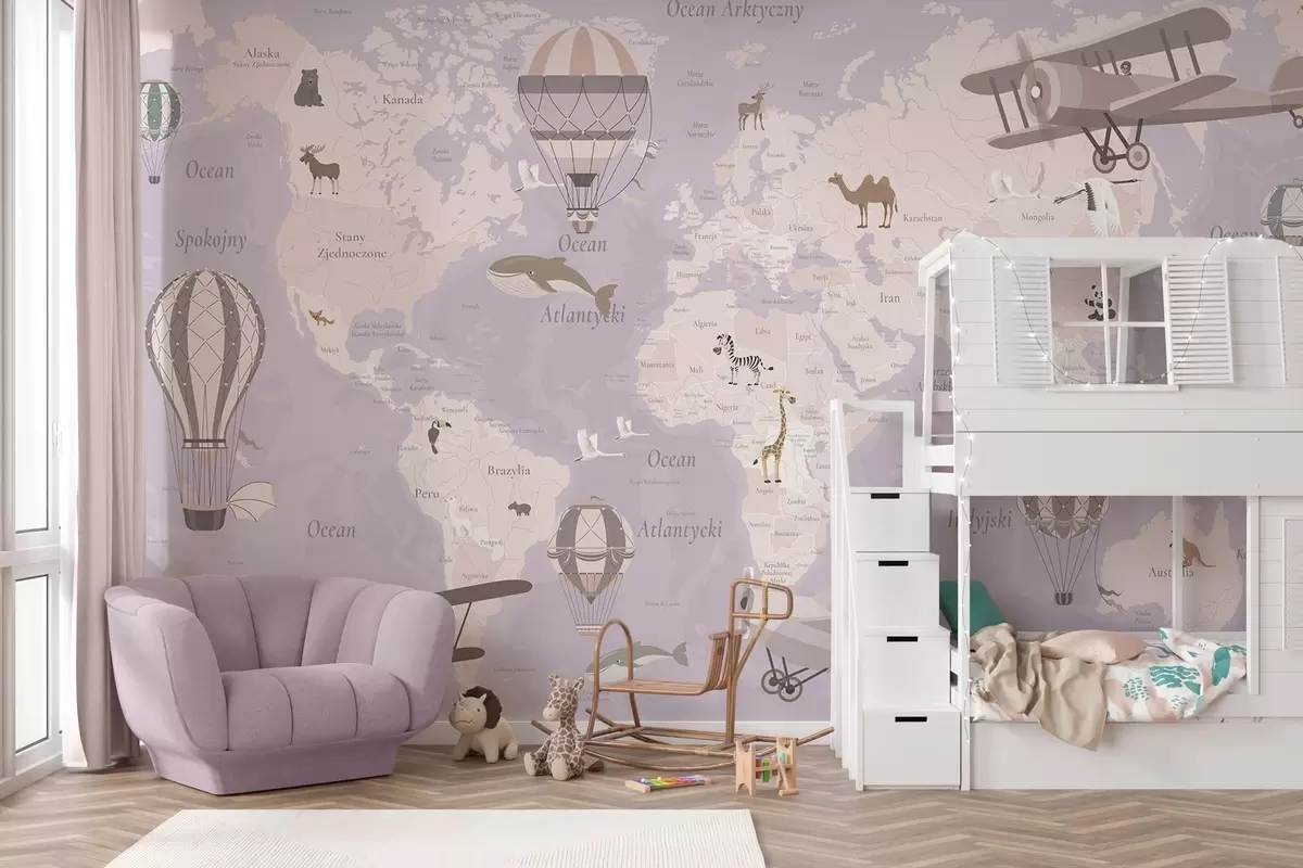 Fotomurales Mapa mundial infantil con animales, aviones y globos aerostáticos. Idioma polaco. Color morado. Nr. c00003plv4