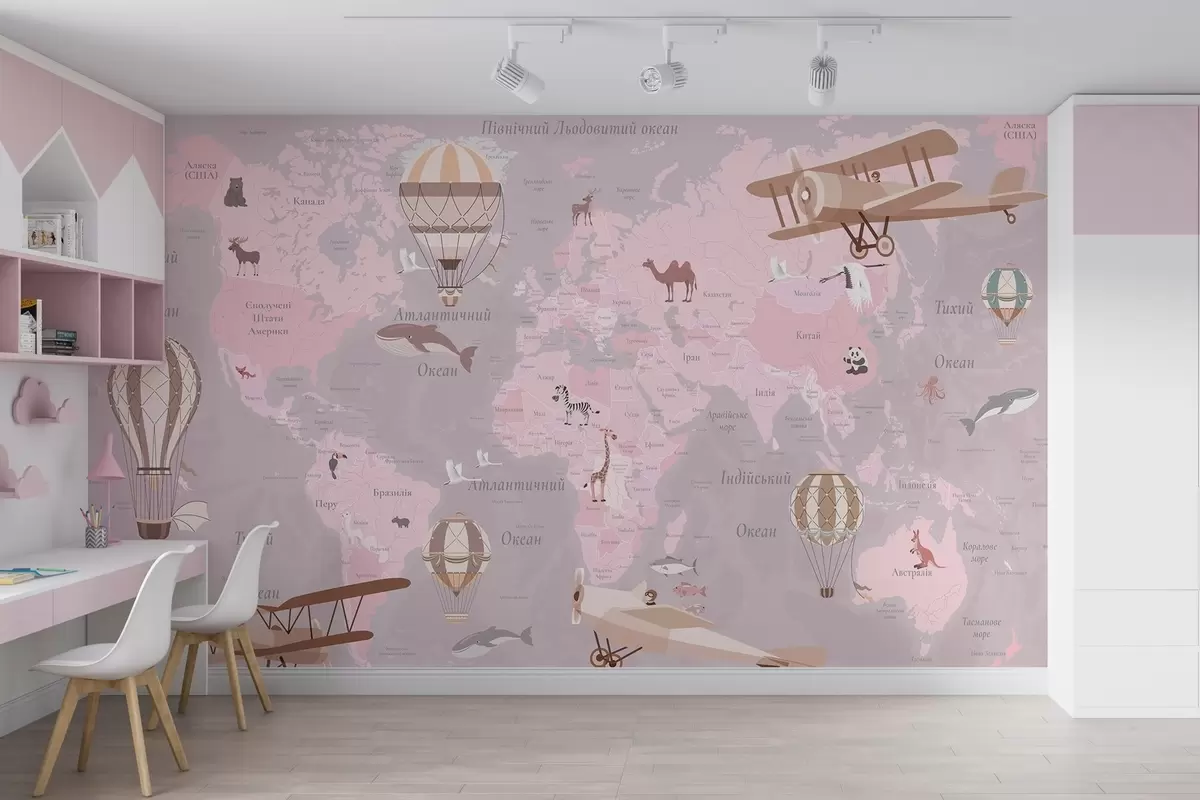 Fotomurales Mapa mundial infantil con animales, aviones y globos aerostáticos. Idioma ucraniano. Color rosa. Nr. c00003ukv3