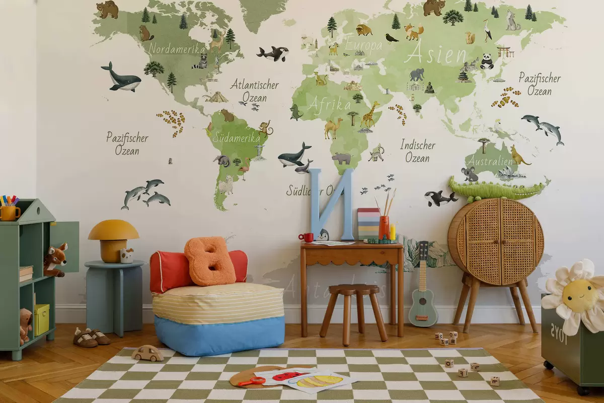 Fotomurales Un mapa de Green en estilo acuarela con animales, plantas y arquitectura. Etiquetas en alemán Nr. c00009dev2