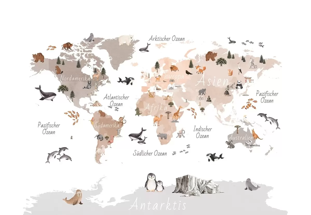 Fotomurales Un mapa en tonos beige, con un estilo de acuarela, en el que aparecen animales, plantas y elementos arquitectónicos. Las leyendas están en alemán. Nr. c00009dev3