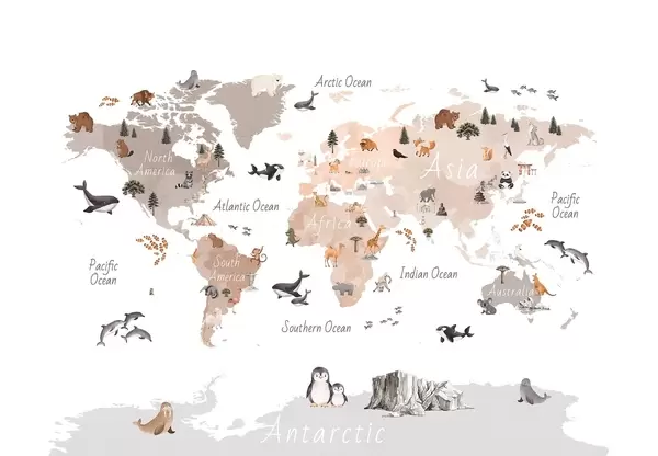 Fotomurales Un mapa a color con estilo de acuarela en el que aparecen animales, plantas y elementos arquitectónicos. Etiquetas en inglés Nr. c00009en