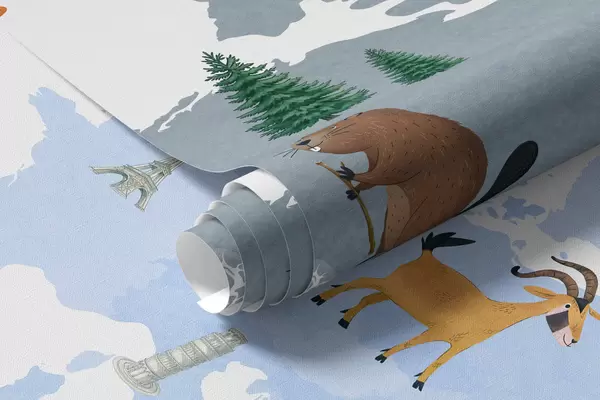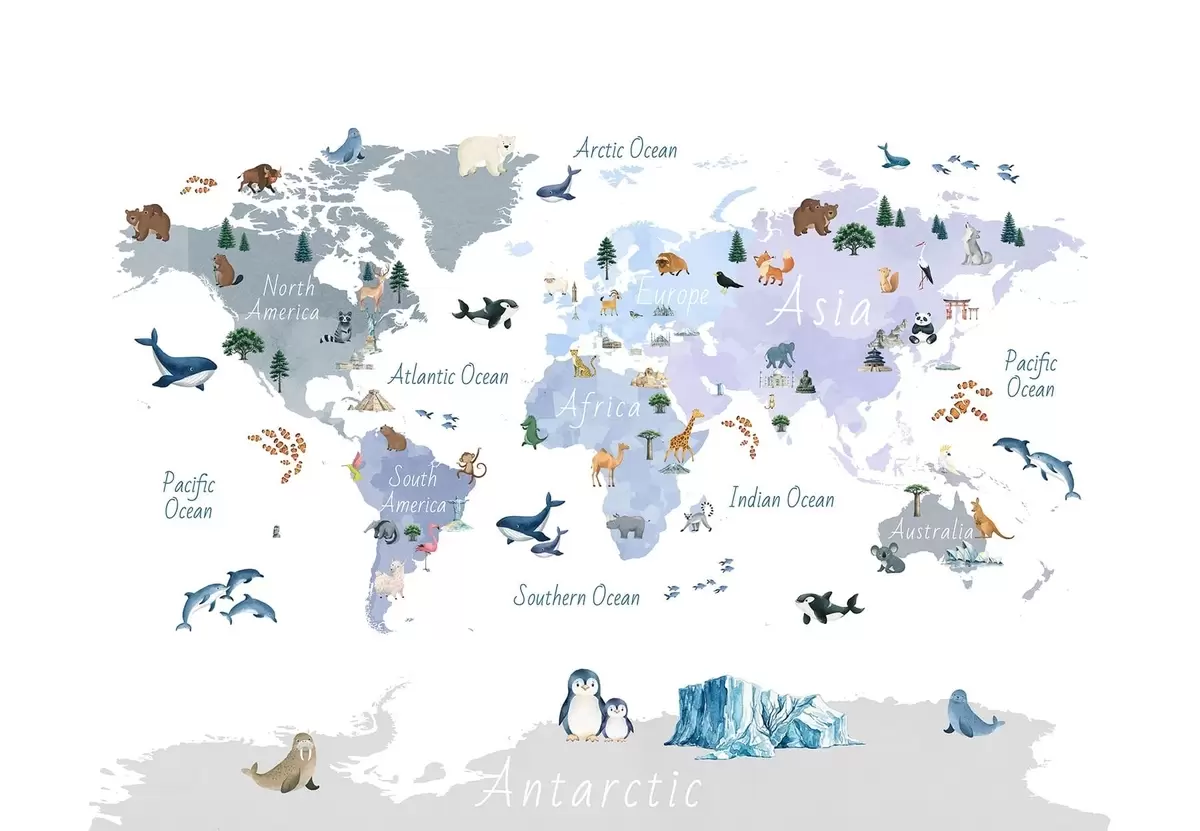 Fotomurales Un mapa azul de estilo acuarela en el que aparecen animales, plantas y elementos arquitectónicos. Etiquetas en inglés Nr. c00009env1