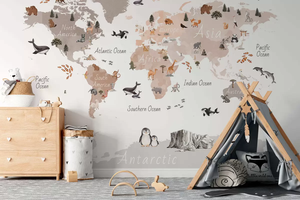 Fotomurales Un mapa en tonos beige, con un estilo de acuarela, en el que aparecen animales, plantas y elementos arquitectónicos. Etiquetas en inglés Nr. c00009env3