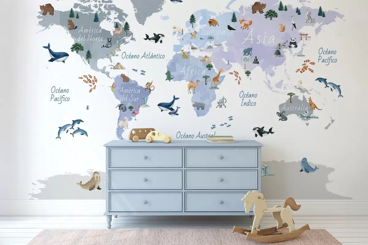 Fotomurales Un mapa azul de estilo acuarela en el que aparecen animales, plantas y elementos arquitectónicos. Etiquetas en español Nr. c00009esv1