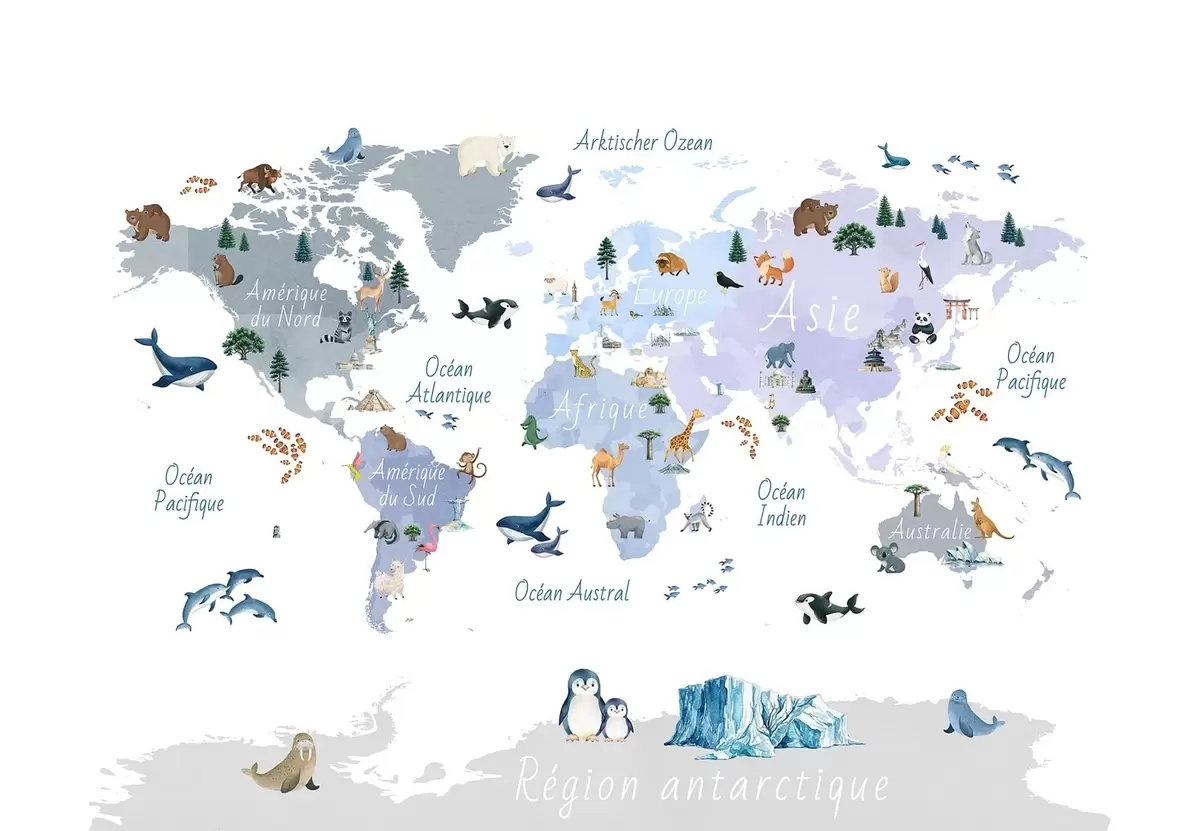 Fotomurales Un mapa azul de estilo acuarela en el que aparecen animales, plantas y elementos arquitectónicos. Rótulos en francés Nr. c00009frv1
