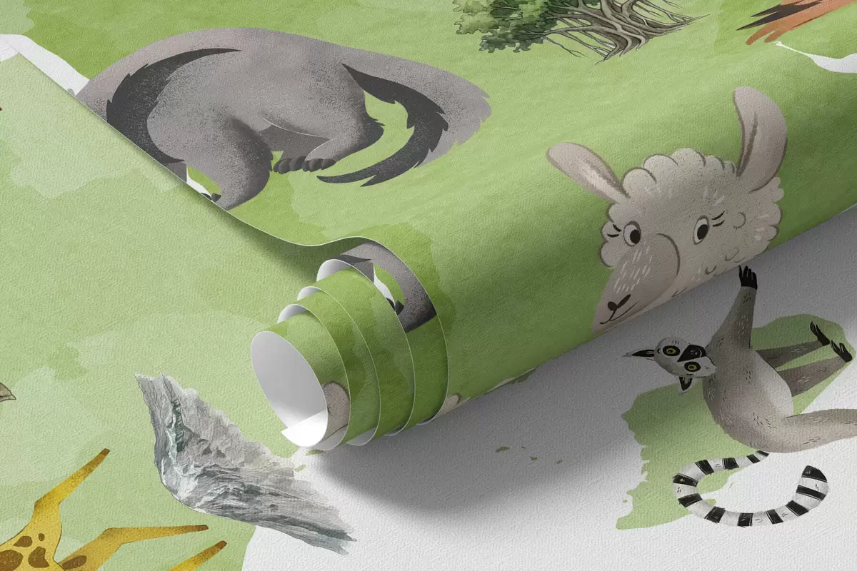 Fotomurales Un mapa de Green en estilo acuarela con animales, plantas y arquitectura. Etiquetas en francés Nr. c00009frv2