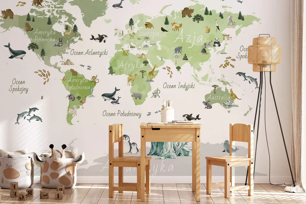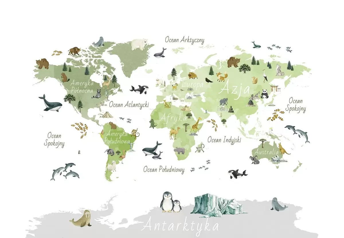 Fotomurales Un mapa de Green en estilo acuarela con animales, plantas y arquitectura. Etiquetas en polaco Nr. c00009plv2