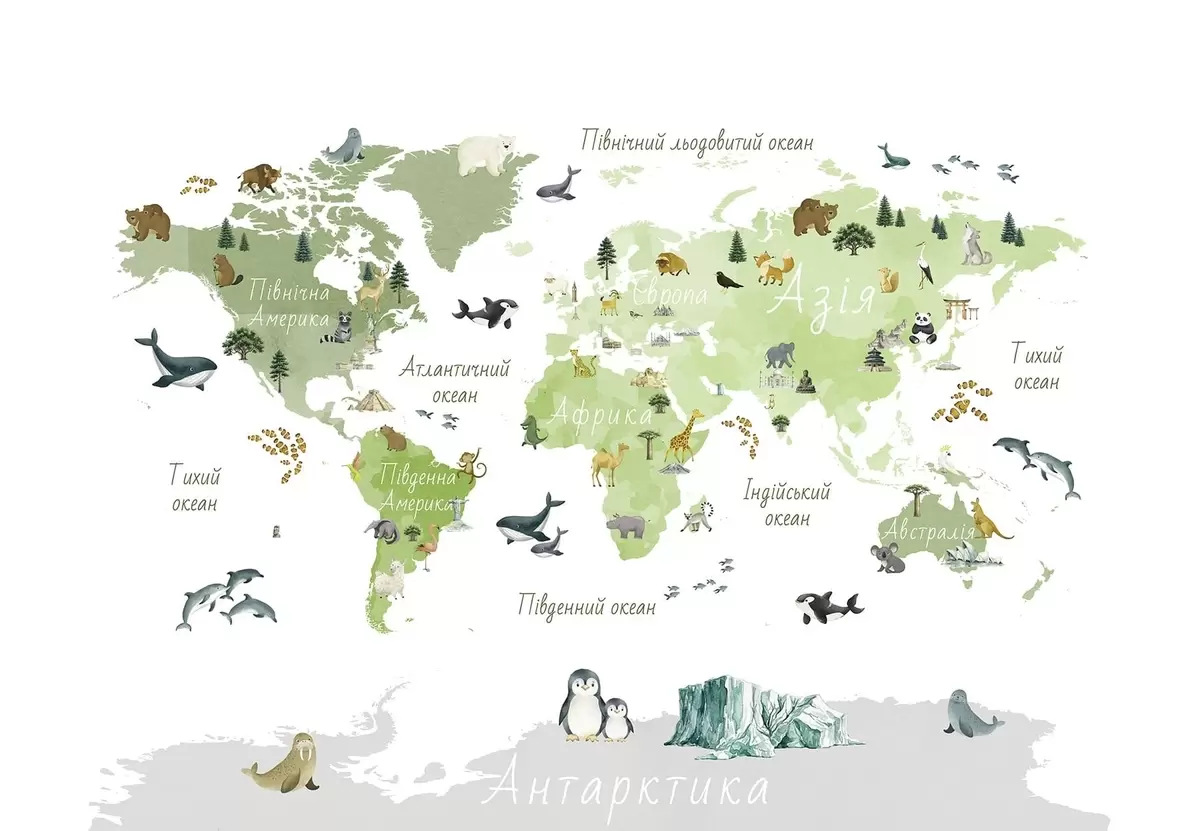 Fotomurales Un mapa de Green en estilo acuarela con animales, plantas y arquitectura. Etiquetas en ucraniano Nr. c00009ukv2
