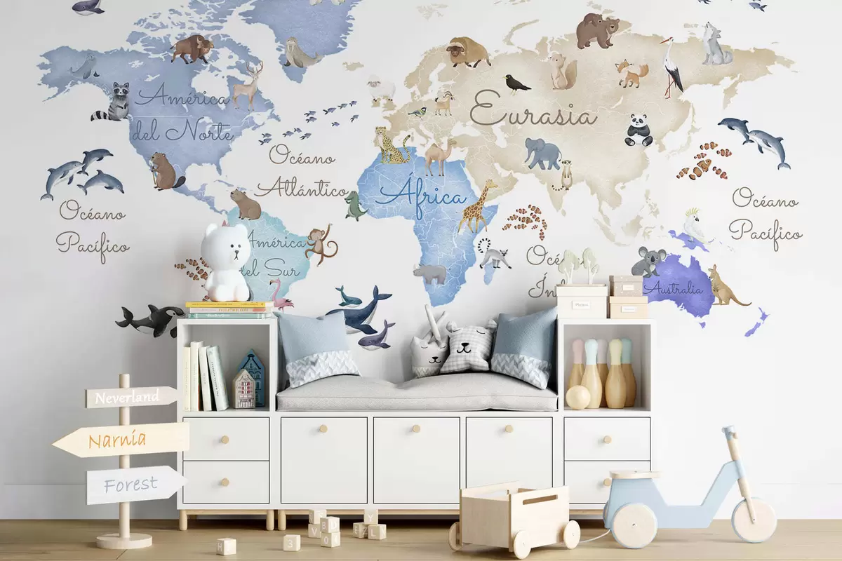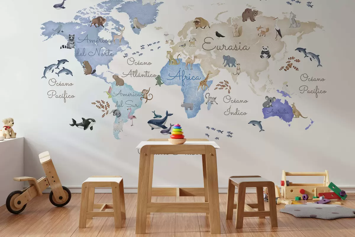 Fotomurales Un mapa azul con estilo de acuarela en el que aparecen animales. Etiquetas en español Nr. c00012esv1