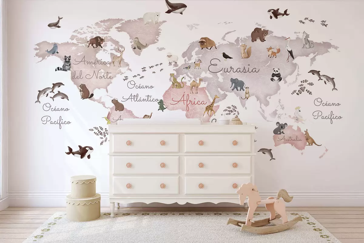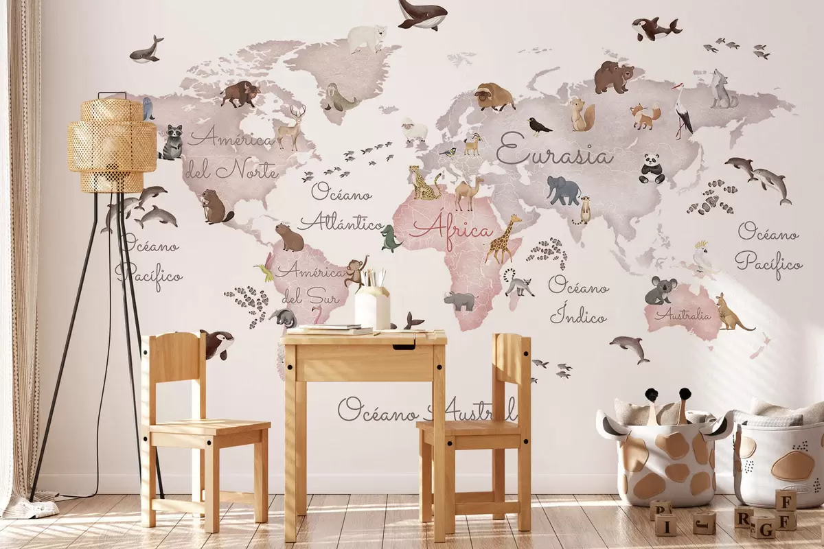 Fotomurales Un mapa en tonos beige, con un estilo de acuarela, en el que aparecen animales. Rótulos en español Nr. c00012esv3