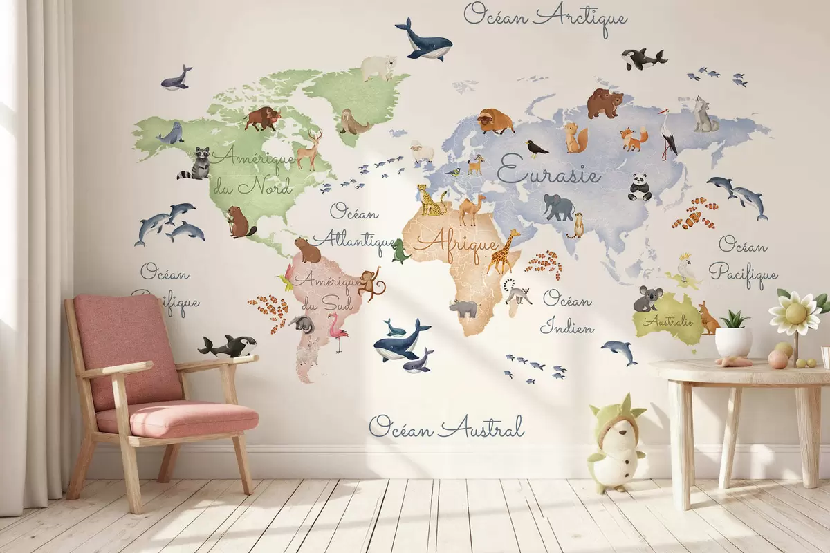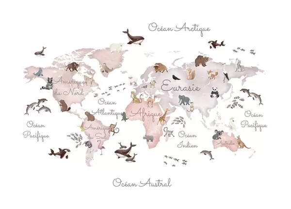 Fotomurales Un mapa a color con estilo de acuarela en el que aparecen animales. Etiquetas en francés Nr. c00012fr