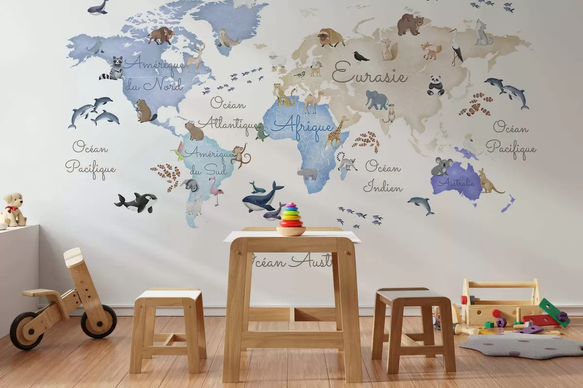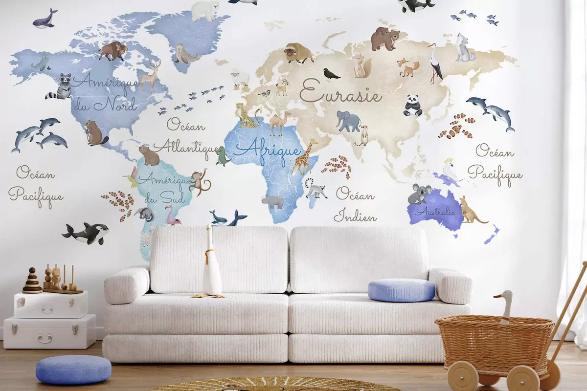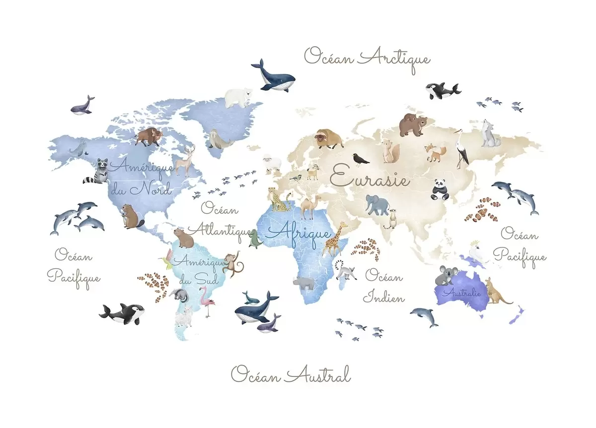Fotomurales Un mapa azul de estilo acuarela con animales. Etiquetas en francés Nr. c00012frv1
