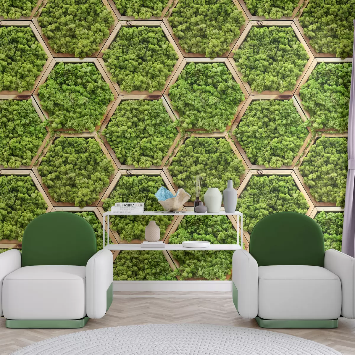 Fotomurales Módulos de flores de musgo en marcos de madera hexagonales Nr. u95502