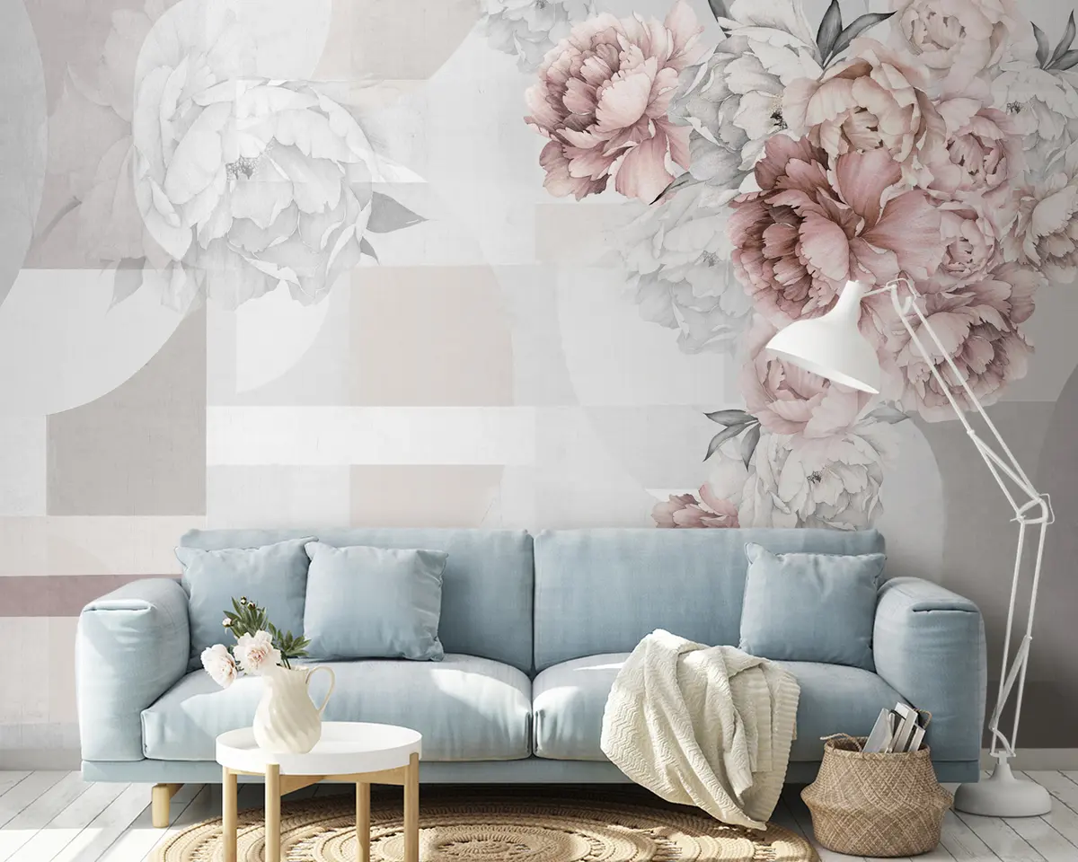 Fotomurales Peonías de acuarela en color rosa con fondo geométrico. Nr. u95855