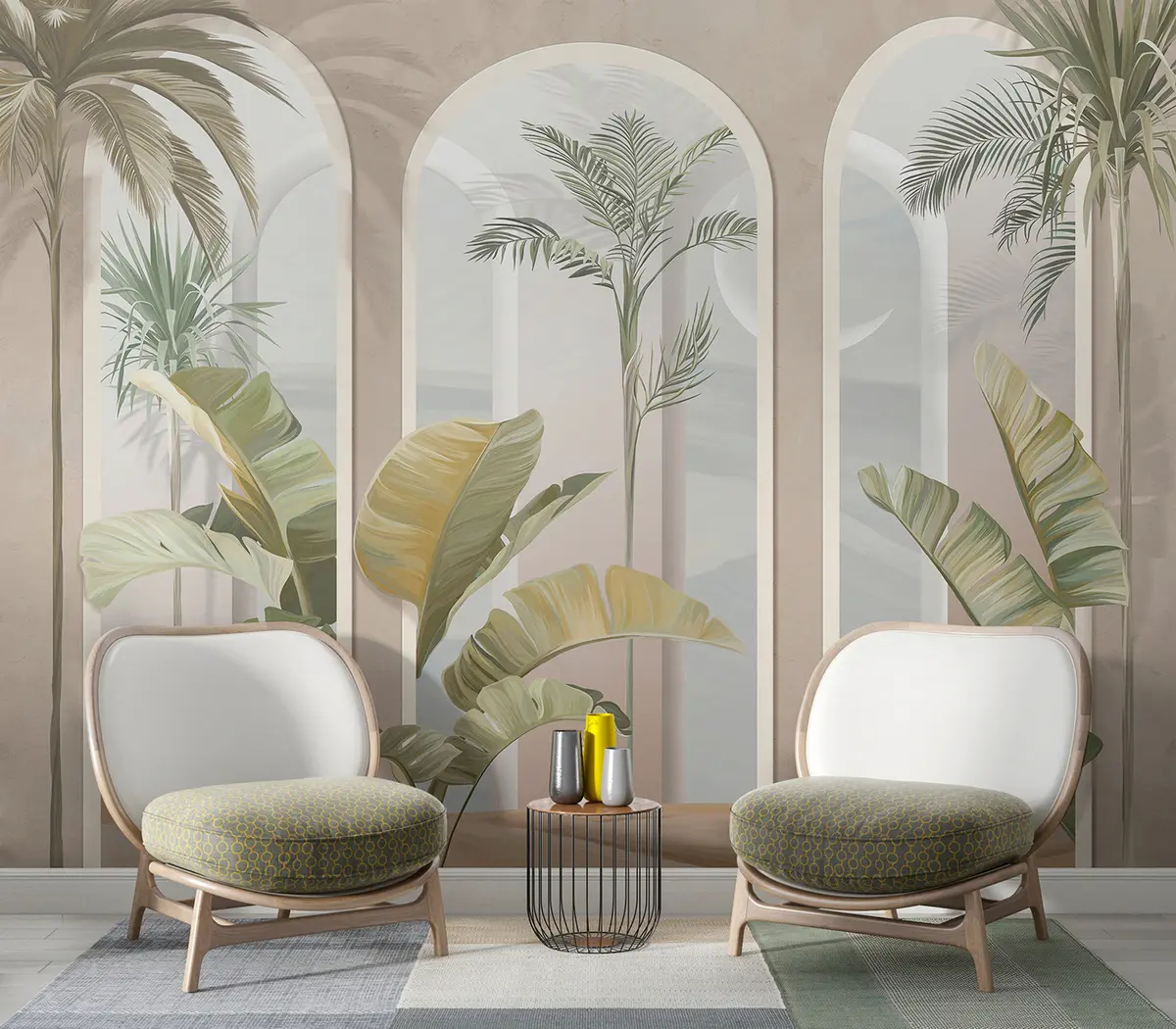 murales de pared Hojas tropicales 3D con palmeras y columnas. u96402