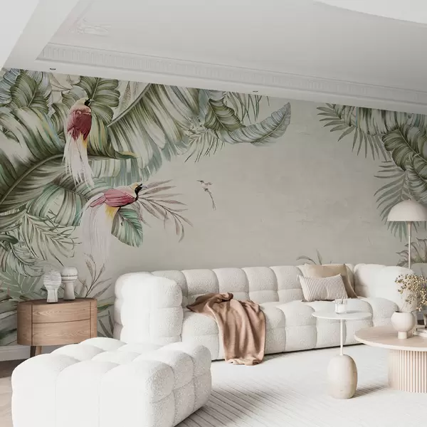 murales de pared Plantas tropicales y pájaros sobre fondo texturizado u96550