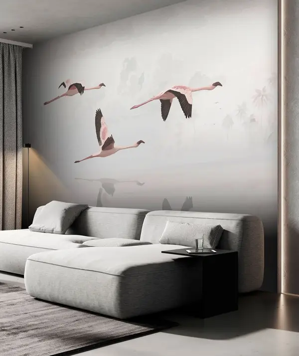 Fotomurales Flamencos rosados sobre la playa y el mar de la selva tropical Nr. u97457
