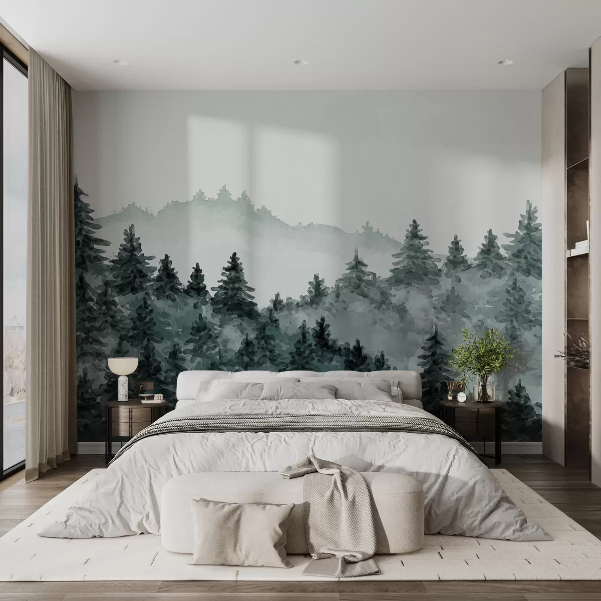 Fotomurales Acuarela paisaje forestal, niebla, color verde, pinos Nr. u98994