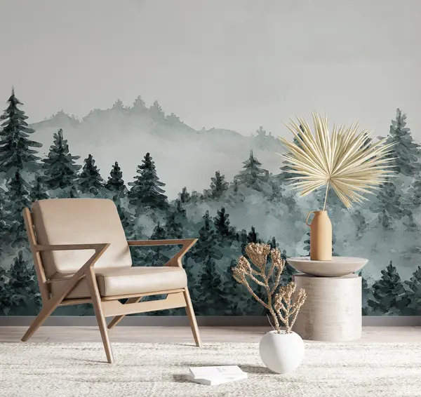Fotomurales Acuarela paisaje forestal, niebla, color verde, pinos Nr. u98994