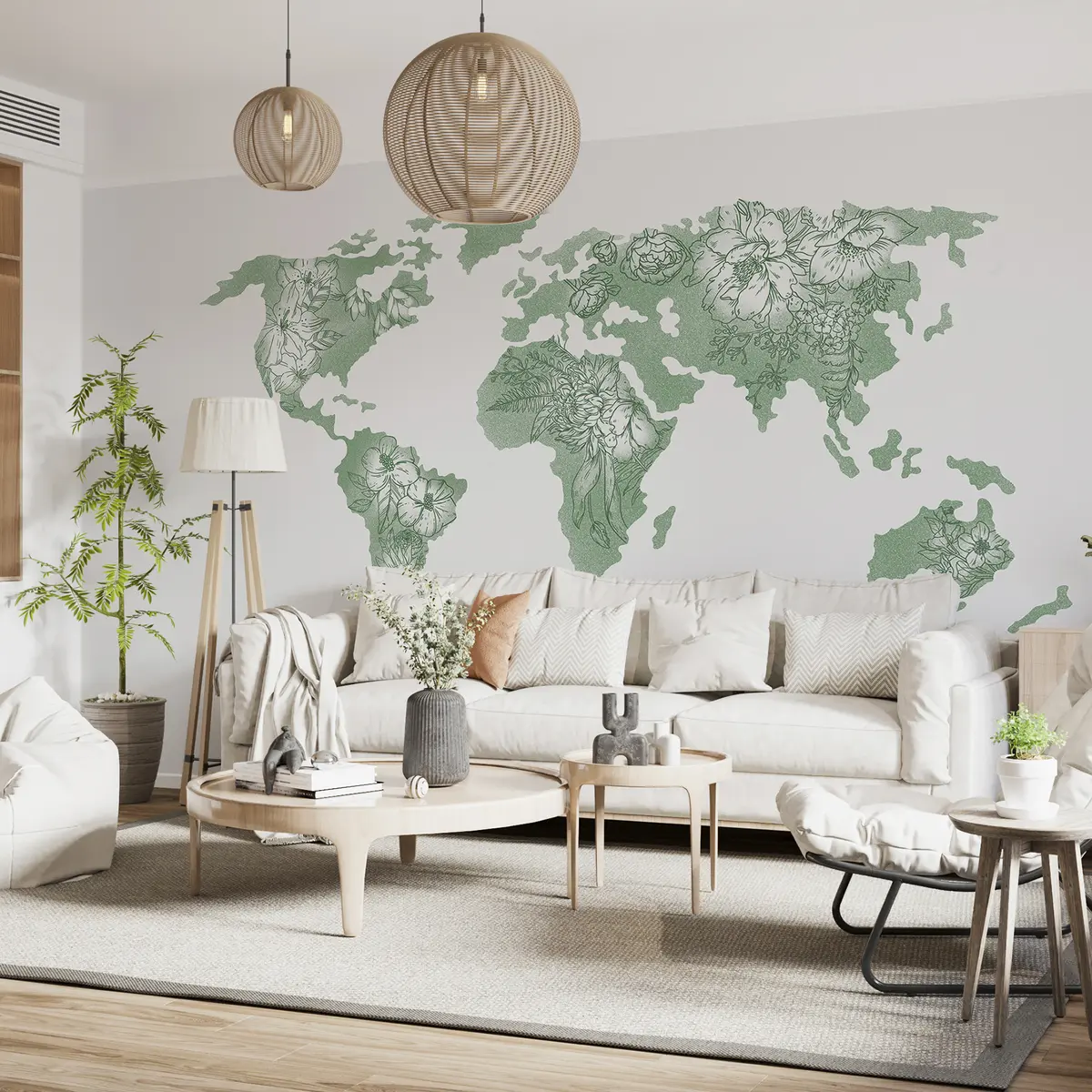 Fotomurales Mapamundi floral, ornamental, peonías, lirio, color verde, dibujo lineal arte Nr. u99734v3