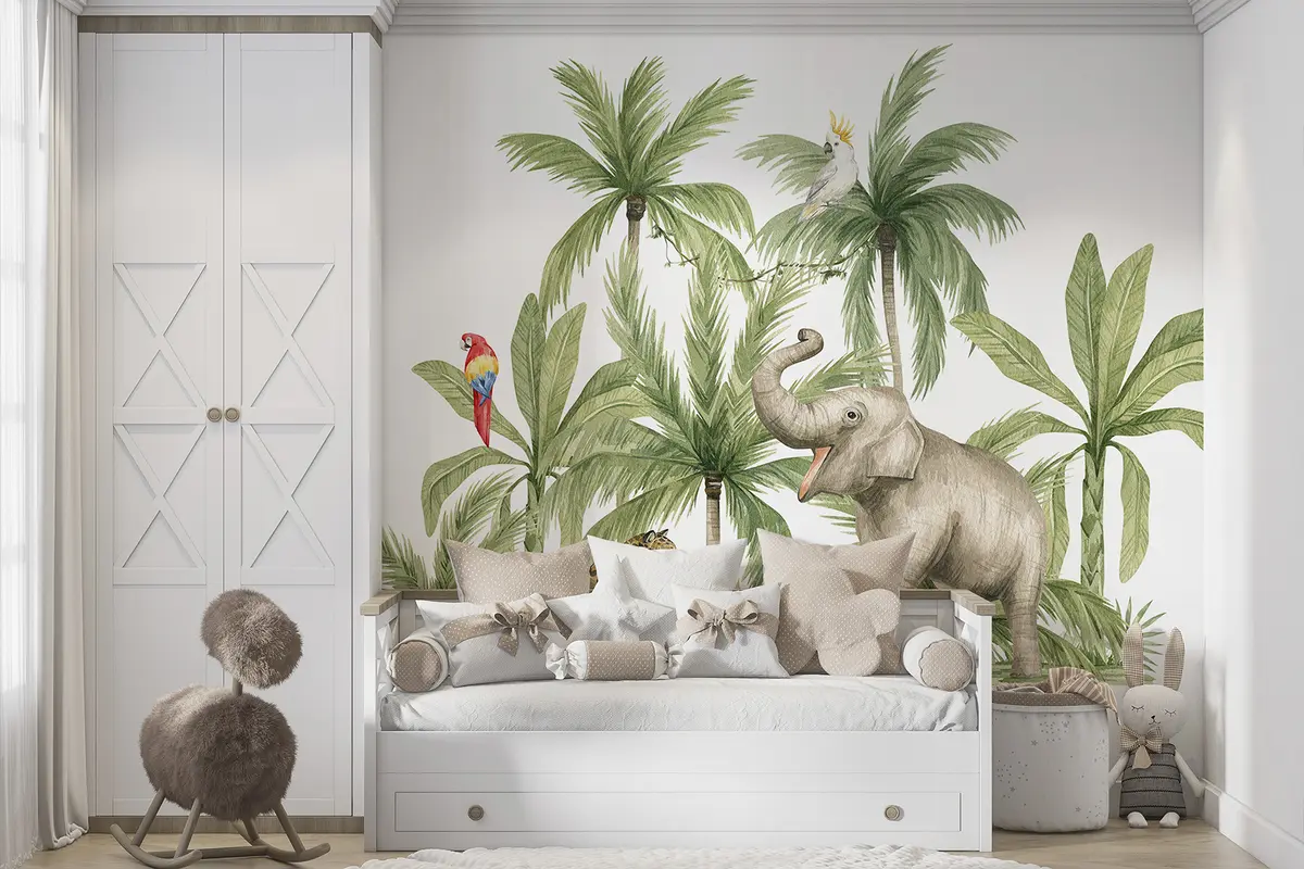 Fotomurales Animales de safari, elefante, leopardo, mono, palmeras, dibujo a lápiz, loros Nr. w00084