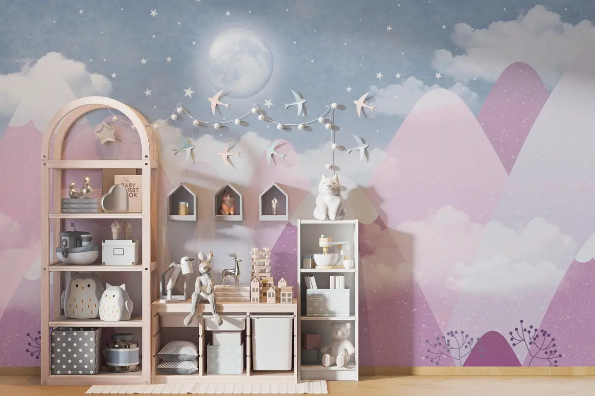 Fotomurales Luna sobre montañas nevadas ilustración infantil en azul Nr. w00374v1