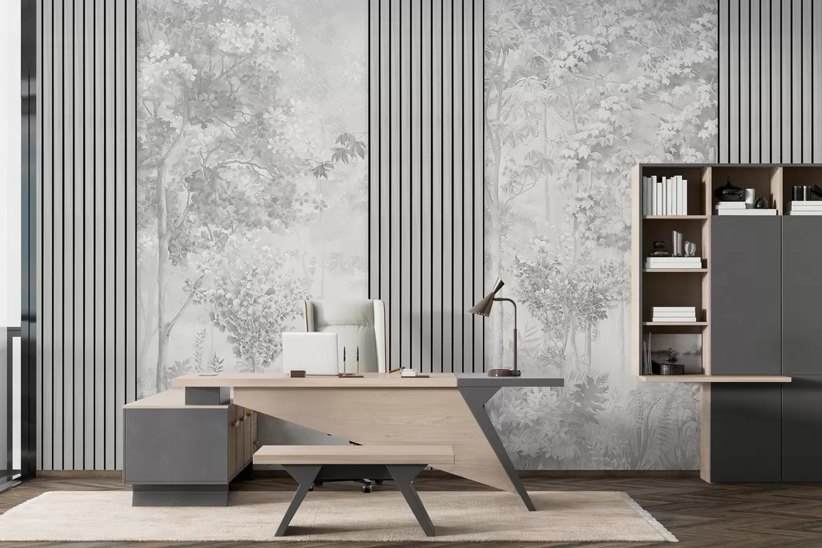 Fotomurales Paneles de madera y delicado bosque en tonos grises. Nr. w00670v3