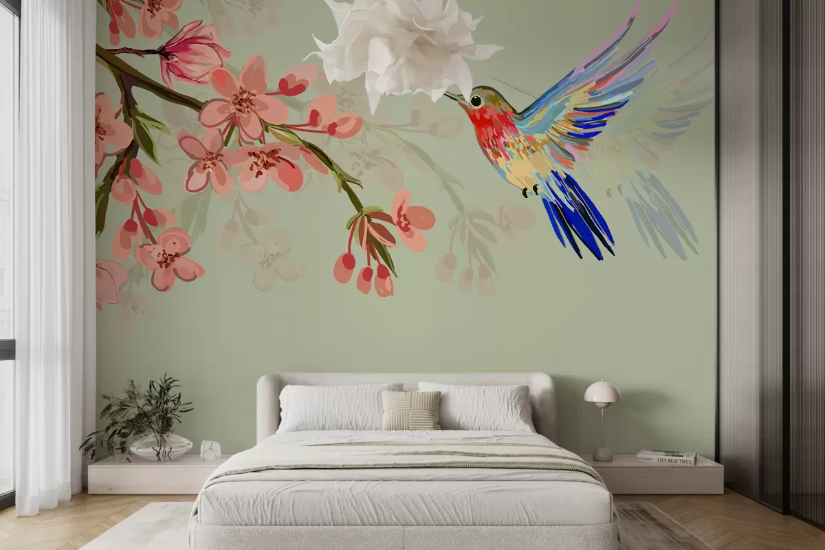 Fotomurales una rama con flores rosas y un pájaro brillante Nr. w00693