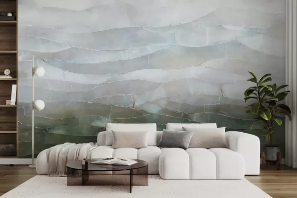 Fotomurales Paisaje texturizado de gradiente abstracto, montañoso y brumoso con campos verdes ondulados a través de la niebla Nr. w00795