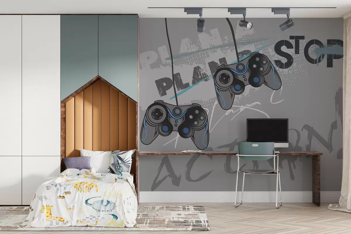 Fotomurales Papel pintado infantil para adolescentes con joysticks y letras gráficas en gris Nr. w00829v1