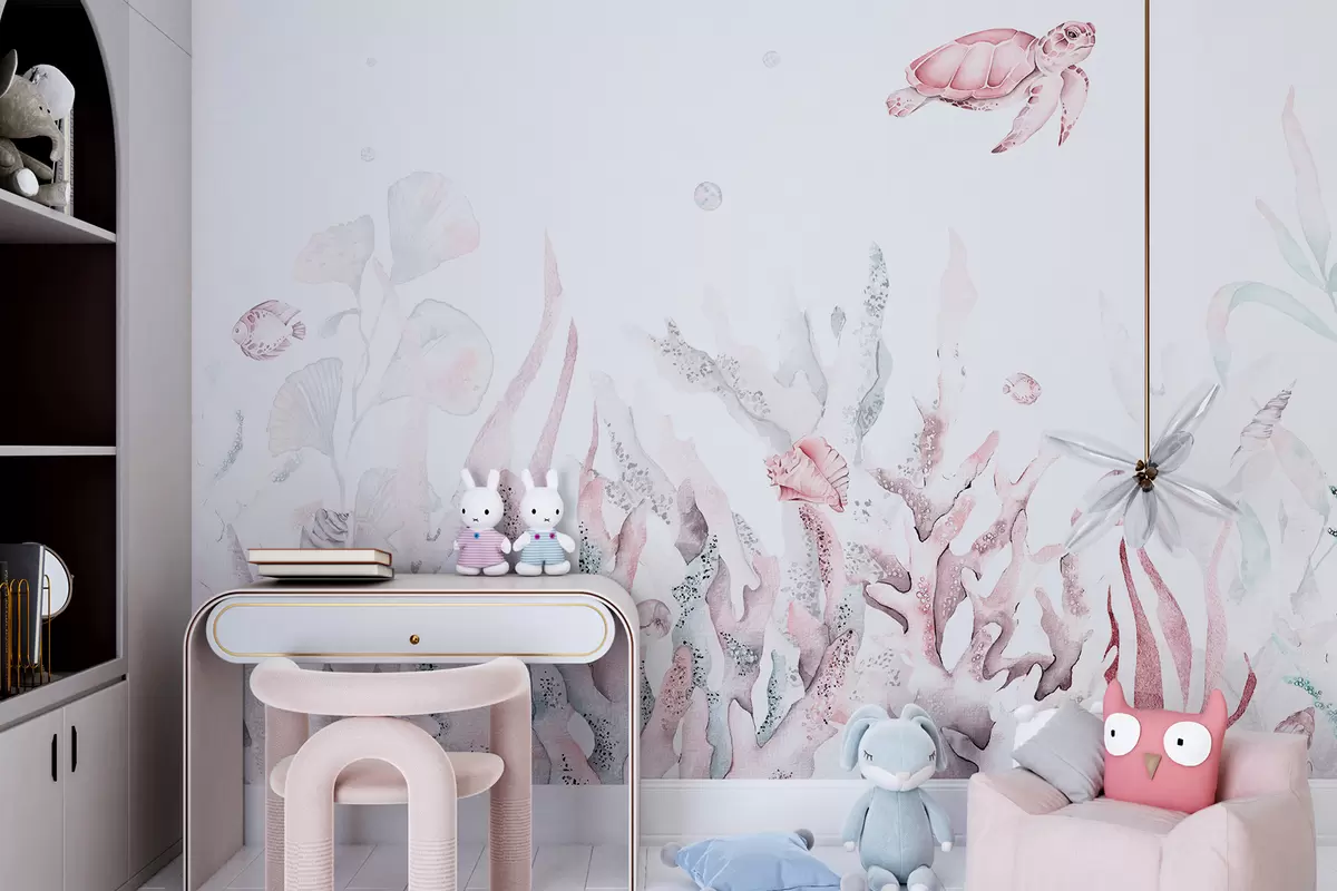Fotomurales Corales marinos acuarela, conchas marinas, tortugas, vida marina, colores rosas suaves Nr. w00849v2